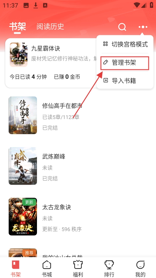 点击右上角的三点图标,接着选择【管理书架】这一选项,就能进入书架管理模式啦。