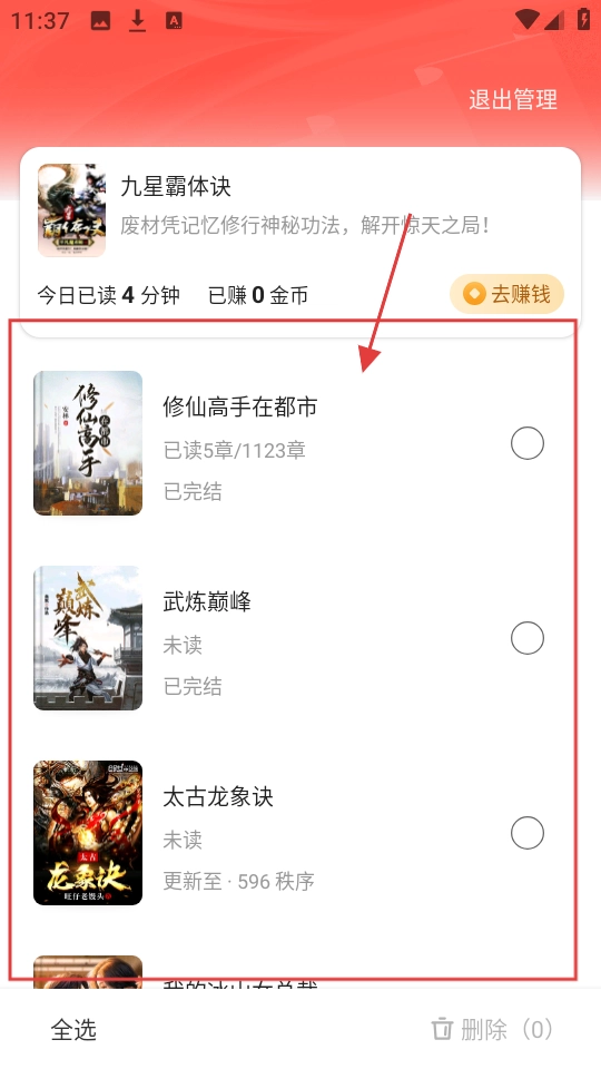 进入管理模式后,就能对书架里的小说进行选择操作,这样整理书架内容会更方便哦。