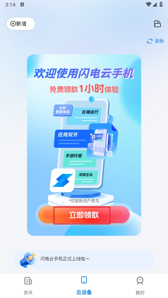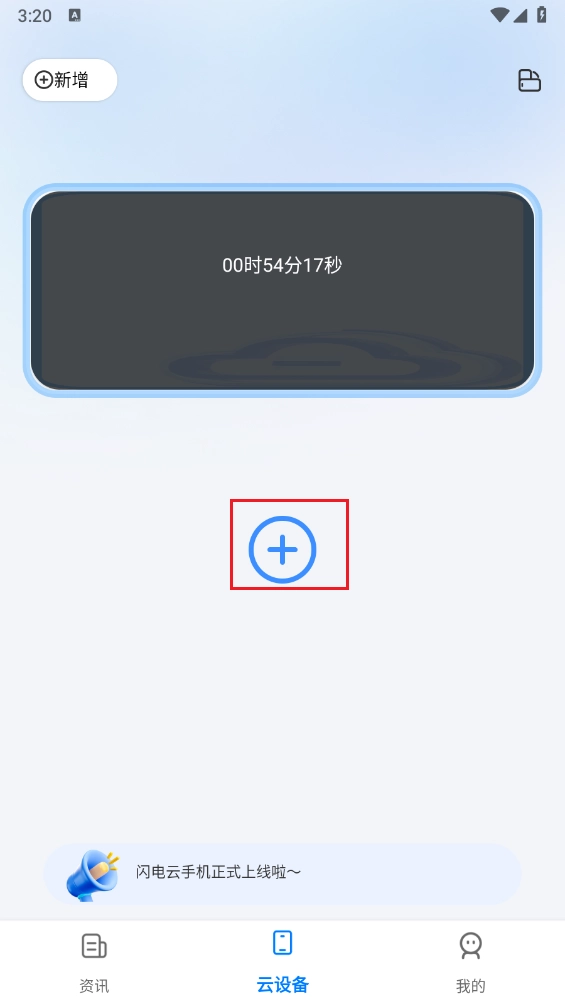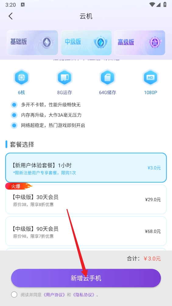 进入云机页面后,挑选对应的套餐,再点击“新增云手机”按钮。