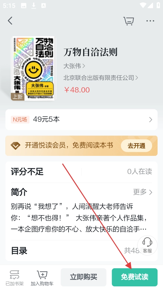 在书籍详情页面,找到【免费试读】按钮并点击,即可开启这本书的免费试读。