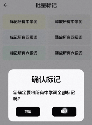 在进度页面展开对应脑图的所有单词节点,点击单词后,在弹出的对话框右上角找到开关按钮,点击它就能标记或取消标记该单词。