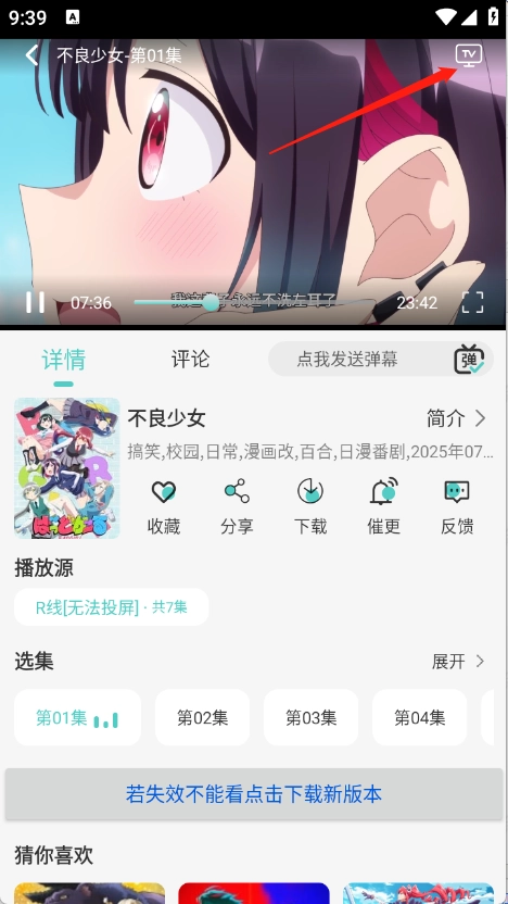 点开你想看的动漫,进入它的播放页面后,点击右上角那个“TV”按钮。