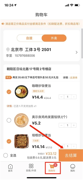 打开蜂便利应用,进入购物车页面后,勾选想要购买的商品,接着点击右下角的“去结算”按钮。