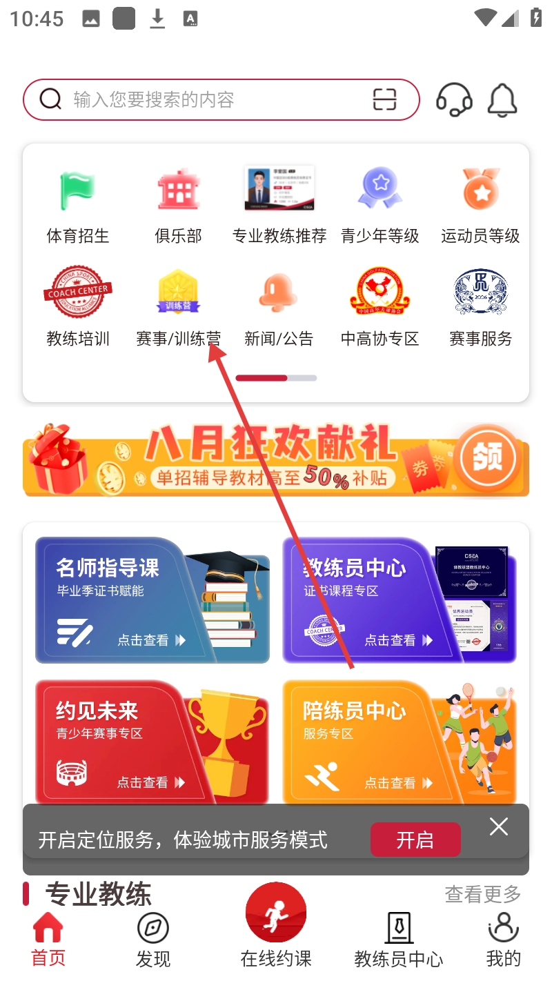 在首页找到并点击【赛事/训练营】选项,即可进入对应的赛事/训练营页面。