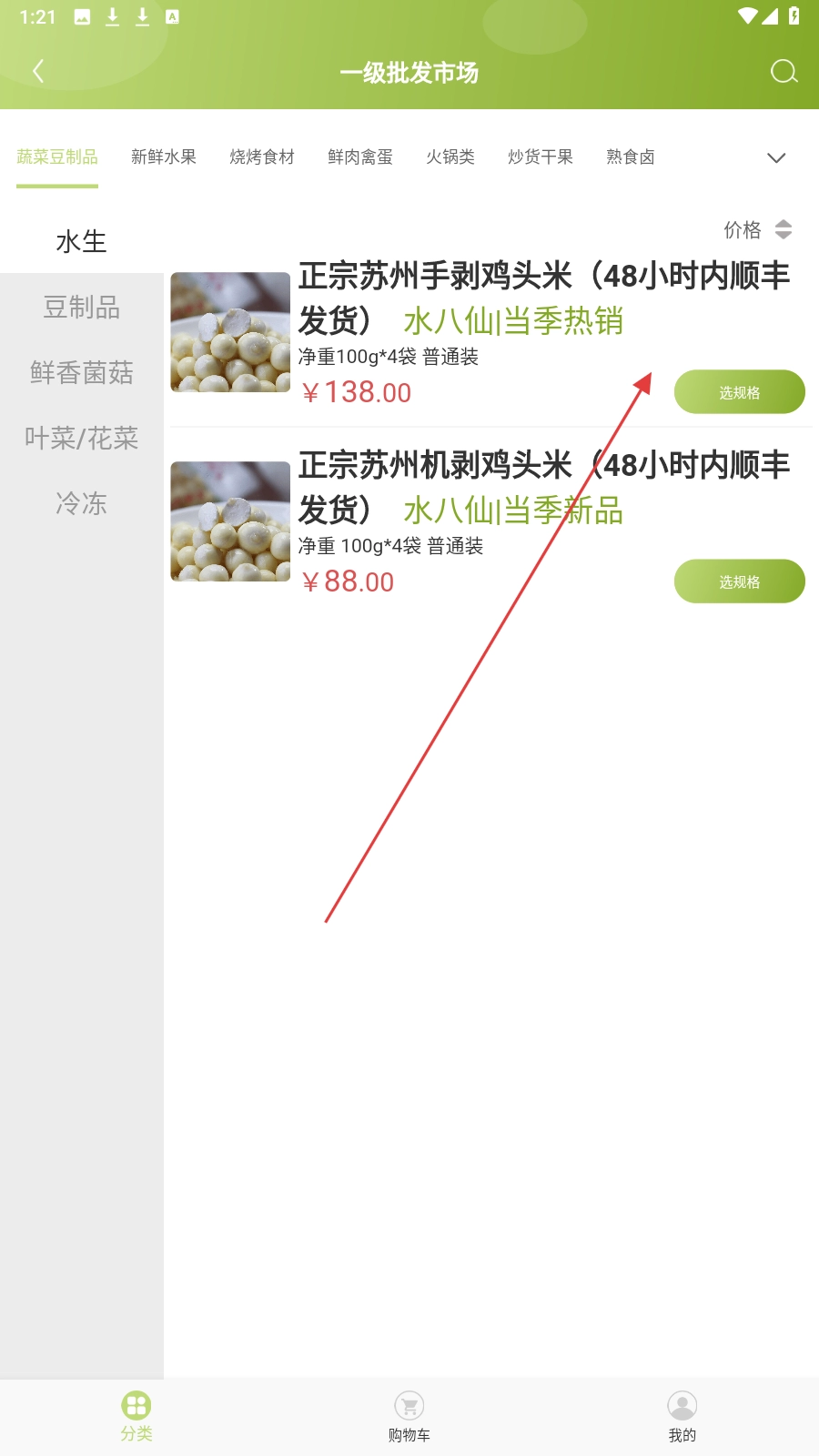 在【综合批发专区】的商品列表里,挑选到喜欢的商品比如【正宗苏州手剥鸡头米】后点击它。