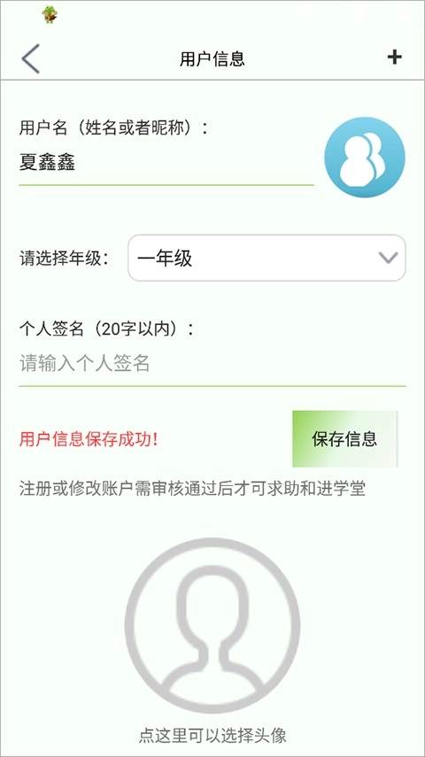 在“用户信息”板块里,你能够填写用户的姓名、挑选对应的年级,还能上传头像图片,完成这些操作后,点击“保存信息”按钮即可。