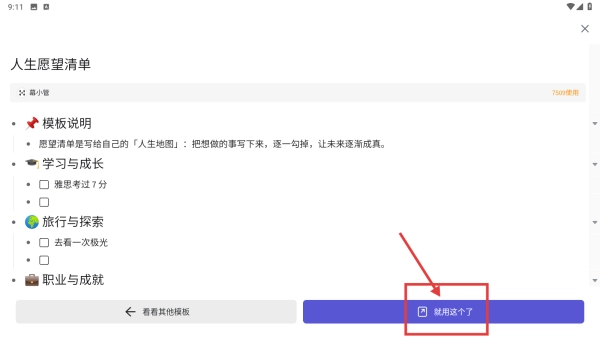 在模板详情页,点击“就用这个了”按钮,即可创建人生愿望清单文档。