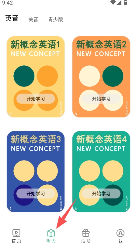 支持版本选择功能,能够挑选英音、美音、青少版等不同版本的新概念英语课程内容。