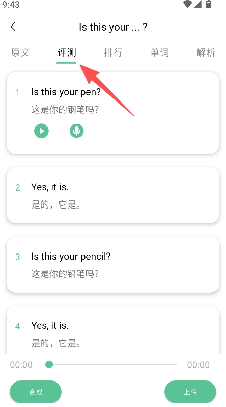 提供多板块学习功能,可查看课文原文、使用评测功能、学习单词及查看解析内容。