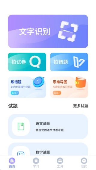 首页集成了文字识别、拍试卷、拍错题、练错题、思维导图及试题等功能。