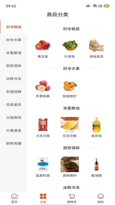 首页:陈列各类生鲜食品,用户能够依据分类、价格等条件筛选商品。