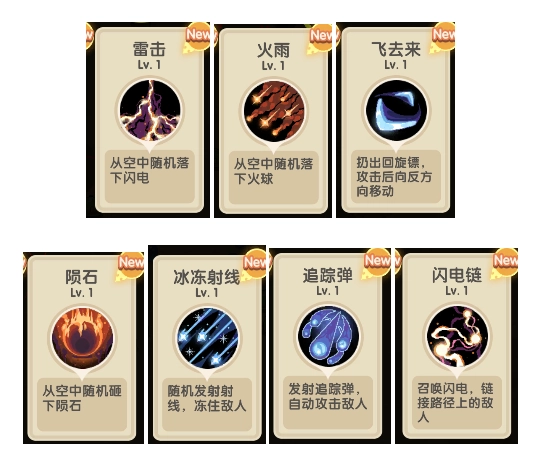 闪电链、追踪弹、冰冻射线、飞去来这类技能都属于自动索敌技能,前期由于攻击范围较大,用起来比较顺手;不过到了关卡后期,它们的伤害会有点不够看,大家可以根据自己的实际情况来选择是否使用。值得一提的是,冰冻射线带有冰冻控制效果,在一些特定场景下会相对更实用一些。