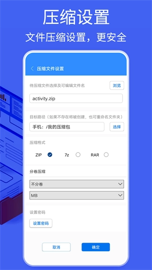 分卷压缩功能:可以把较大的文件拆分成若干个较小的文件,方便进行传输与存储操作。