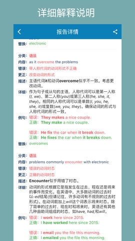 在学习与运用英语时,英语检查助手(OKGrammar)会陪你一起清除语法方面的障碍。它能给出错误分析和科学的解释,每一处英语修改都配有简单易懂的分析内容,助力你掌握常见的各类语法错误。这款智能应用还可用于英语语法作文作业的错误查找,它能够智能地纠正英语错误,帮你修正包括语法错误、拼写错误、冠词代词使用错误以及标点错误等在内的各种问题。其语法检查功能十分严谨,能精准地改正错误,让你的语言表达更接近英语母语者的习惯。