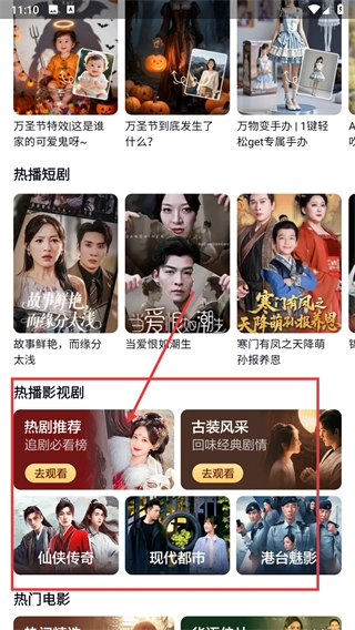 在功能界面的【热播影视剧】分类里,点击【热剧推荐-去观看】,就能进入热门电视剧推荐页面。