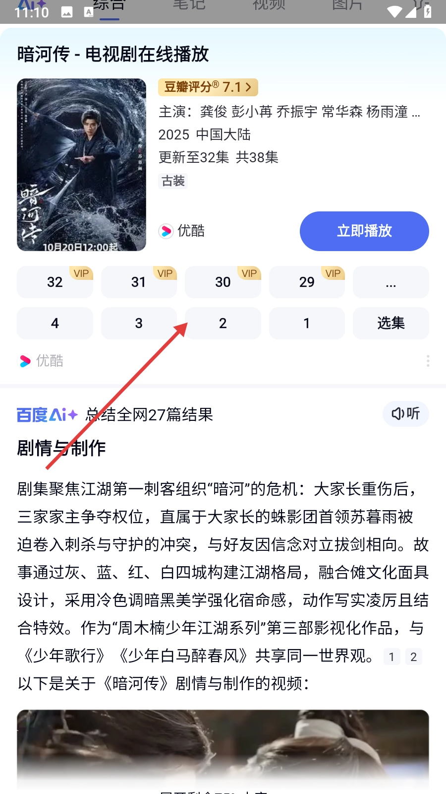 进入《暗河传》的剧集详情页面后,你可以查看这部剧的豆瓣评分、主演阵容、集数等相关信息,挑选你想观看的集数,然后点击【立即播放】按钮就能开始观看了。