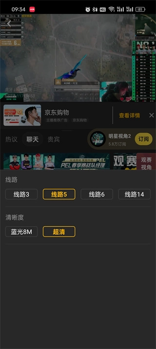 点击任意直播屏幕,呼出菜单,点击"超清"。