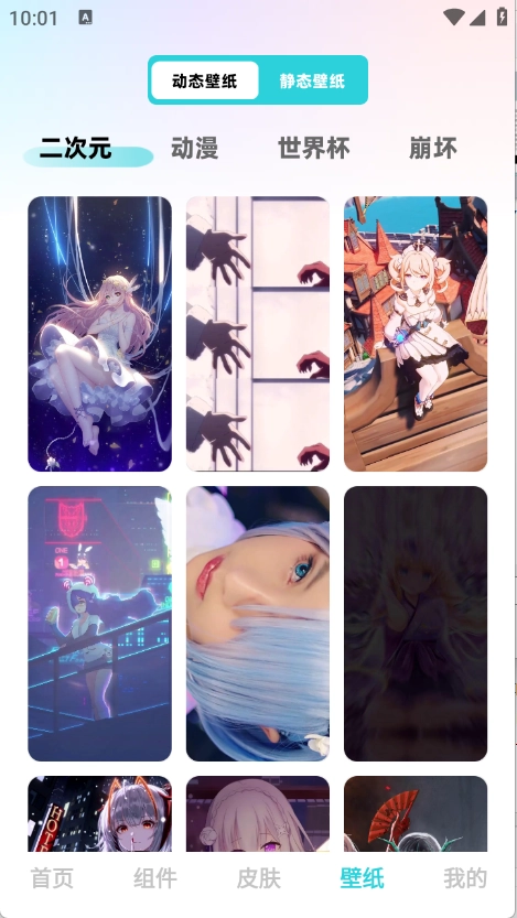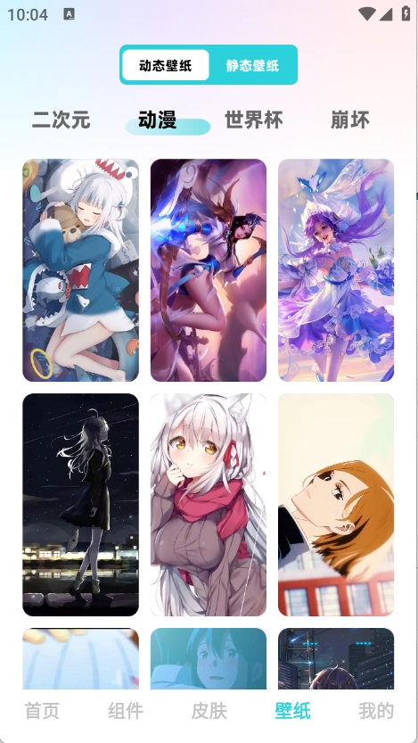 “壁纸”页面汇聚了丰富多样的壁纸资源,其中涵盖了二次元、世界杯以及动漫等不同类型。