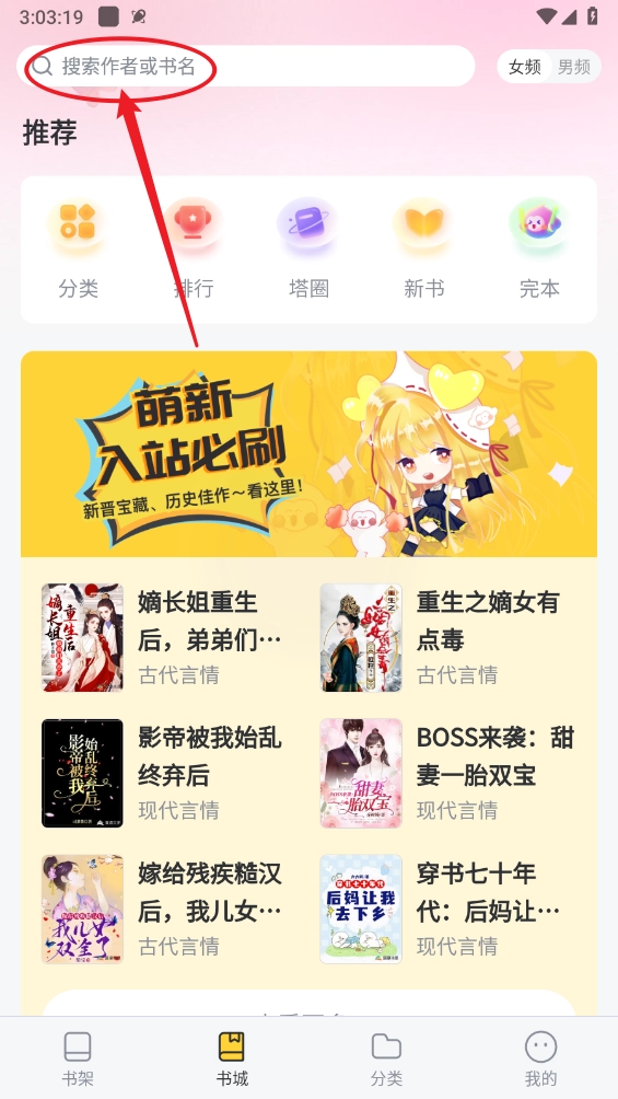 打开软件后,在书城页面找到顶部的搜索框并点击,接着输入作者姓名或者书籍名称进行搜索。