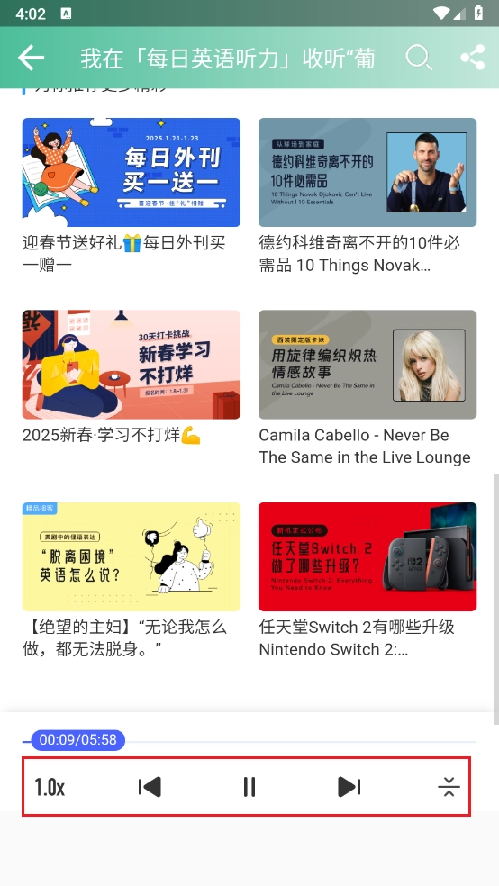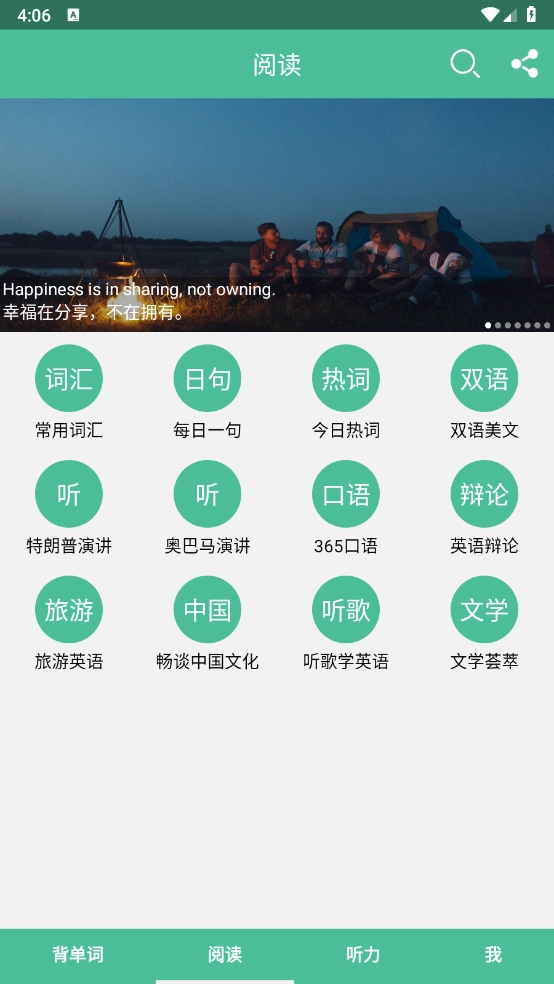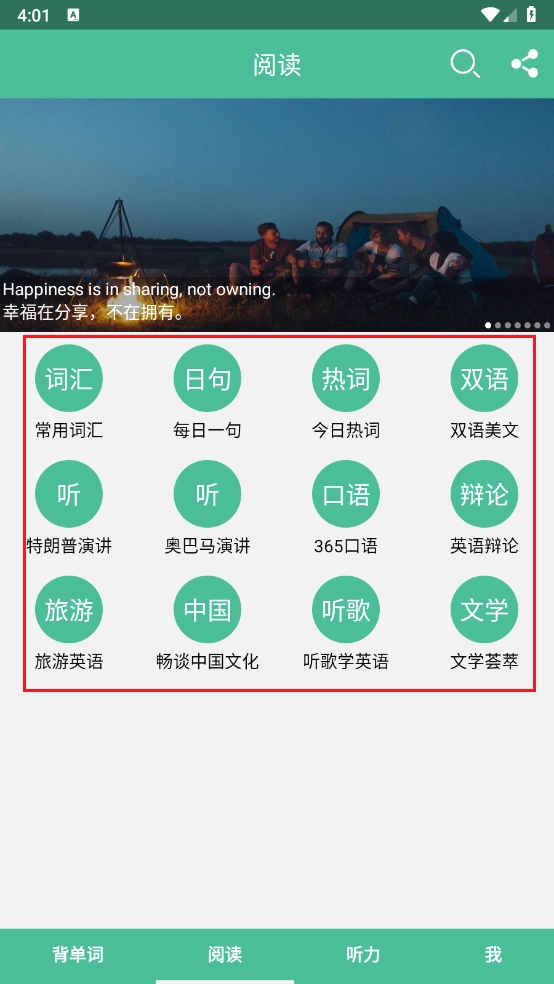 切换到阅读板块后,就能在该板块内查看常用词汇、今日热词等内容了。