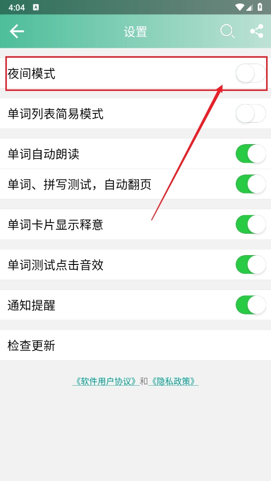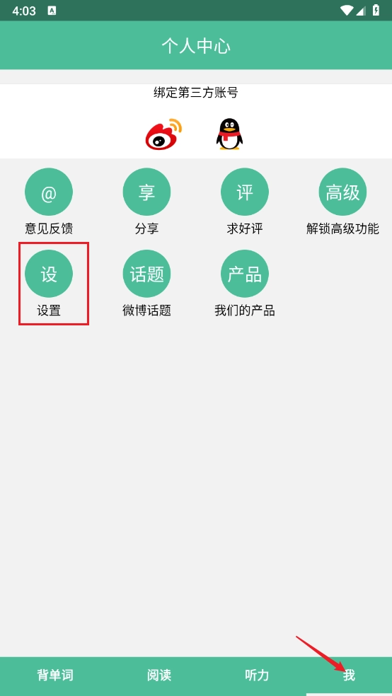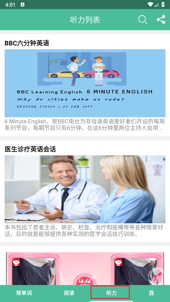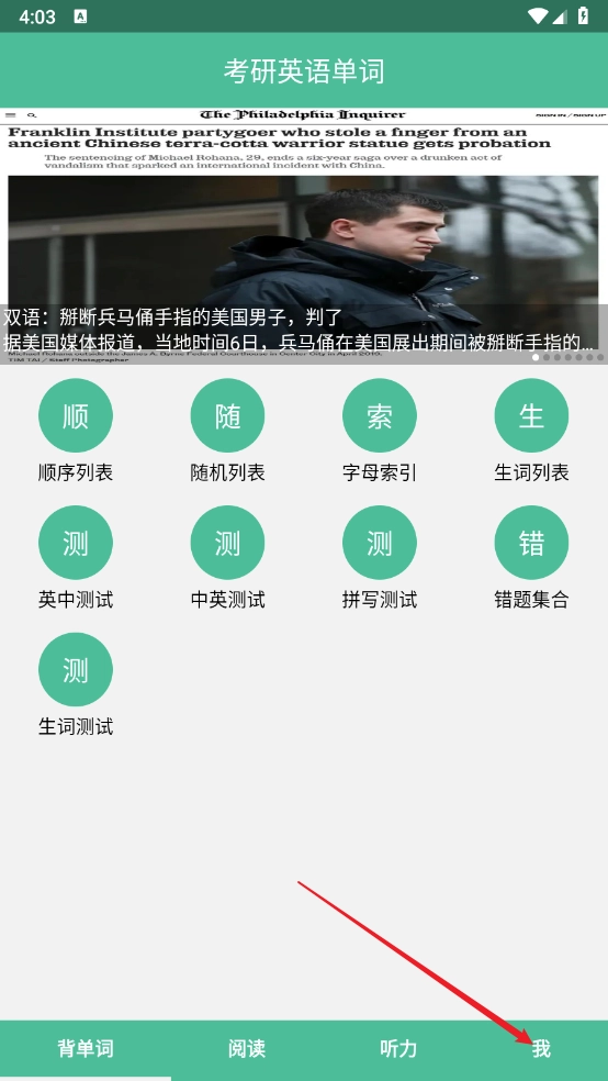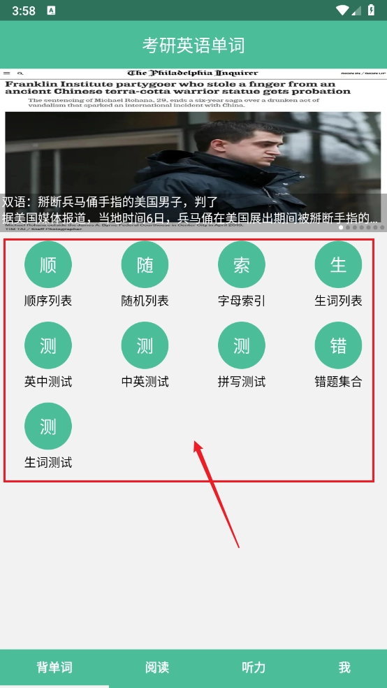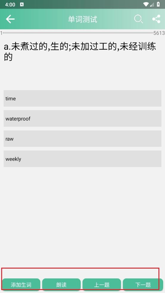点击“中英测试”一键进入后,可通过底部栏目进行朗读或添加生词等操作。