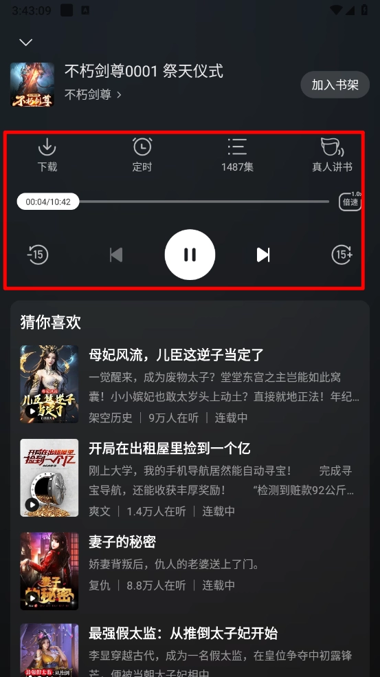 如图,即可开启听书体验,支持、定时、倍数听书哟。