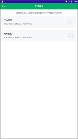请选择您的身份类型,您可以选择以个人身份使用,也可以进行组织机构认证。