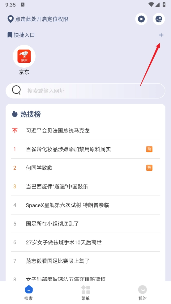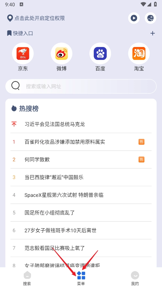 搜索框支持输入关键词和网址链接,一键即可进入;点击底部的五角场按钮可完成收藏,此外在设置界面还能进行分享、多窗口设置等操作。
