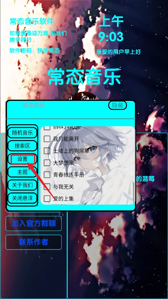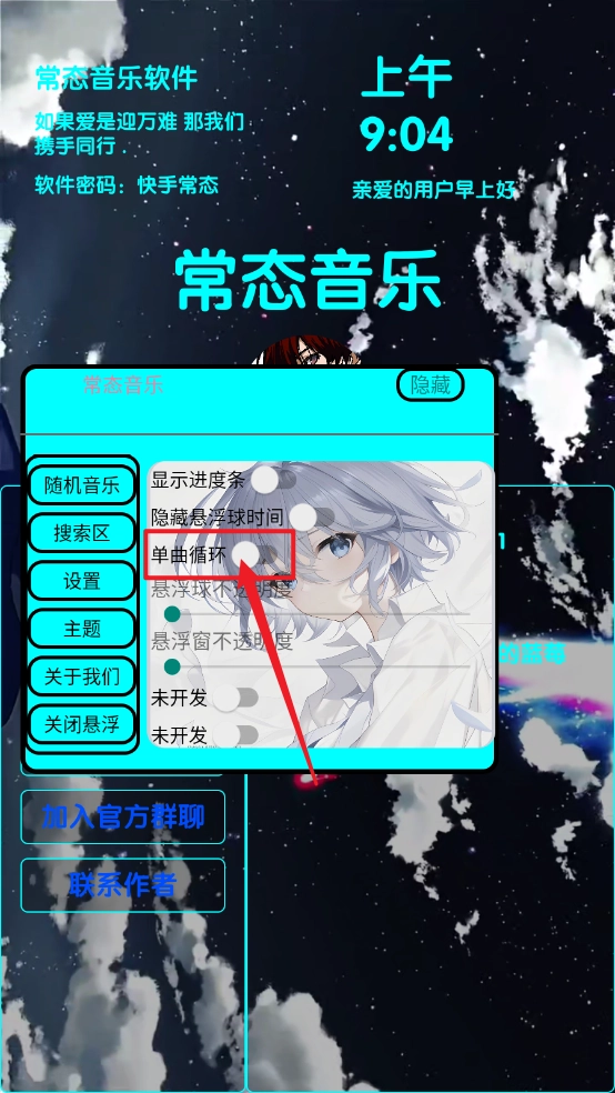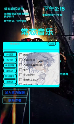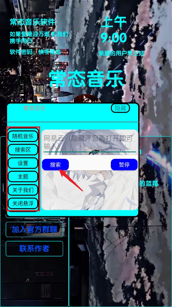 如图所示,这里包含了随机音乐、搜索区域、主题等功能模块,只需一键操作,就能搜索到喜爱的音乐并尽情聆听。