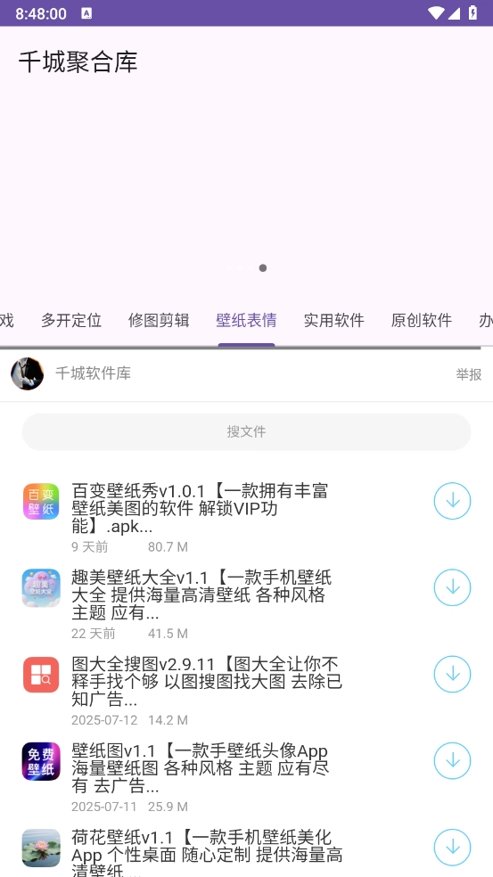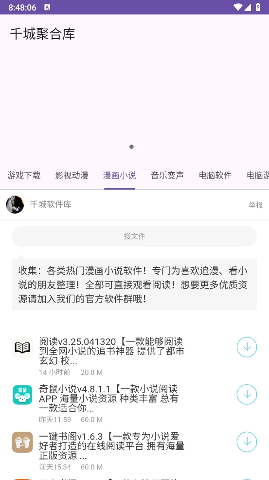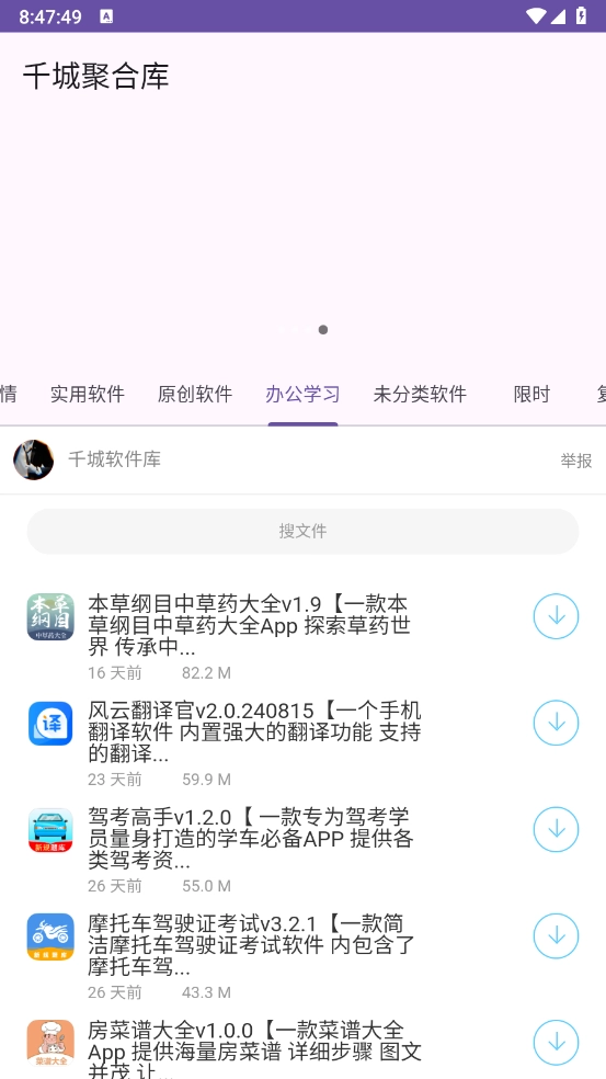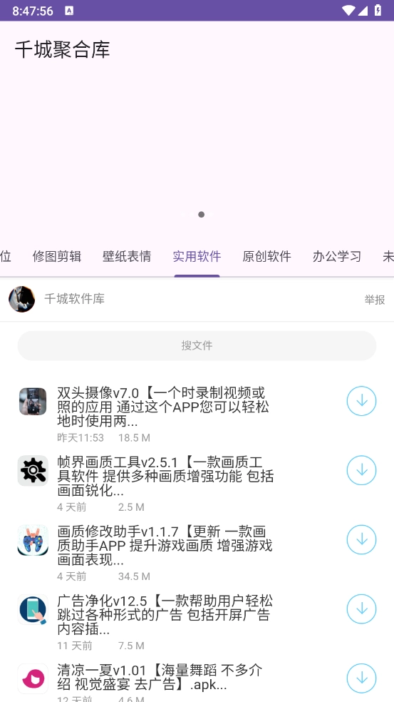 千城聚合库,汇集了大量免费又实用的软件库资源,涵盖学习资料、热门影视、小说漫画、办公工具、游戏辅助等各类内容,资源更新迅速。界面简洁干净没有广告,无需注册登录,打开即可直接使用,另外,还有非常多有趣的安卓游戏和电脑游戏可供挑选。