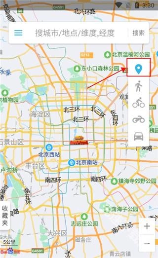 接下来就可以搜索目标地点,或者把地图中心调整到你想伪装的位置,然后点击定位按钮。此时位置服务便会开启,你的位置也已经成功伪装到设定好的地点了。