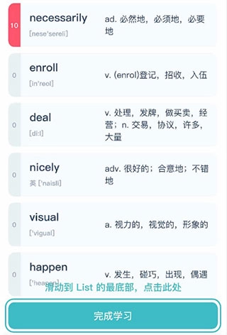 每完成一个List的学习,可点击该List底部的“完成学习”按钮(见下图),以此完成打卡记录。