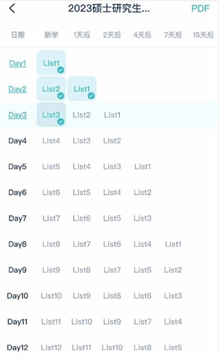 学习计划清单,每日的单词学习都包含记忆与复习两个环节,只有当当天的记忆和复习任务全部完成后,方可开启次日的学习。勾选标记意味着对应的记忆或复习任务已完成。例如,从图中可见,Day3已完成list3的记忆任务,但还需完成list1和list2的复习任务,之后才能进入Day4的学习阶段。
