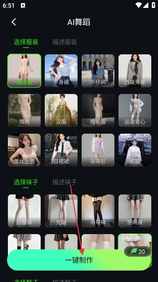 在创作页面挑选服装、袜子之类的元素后,点击【一键制作】按钮,就能生成相同款式的舞蹈作品。