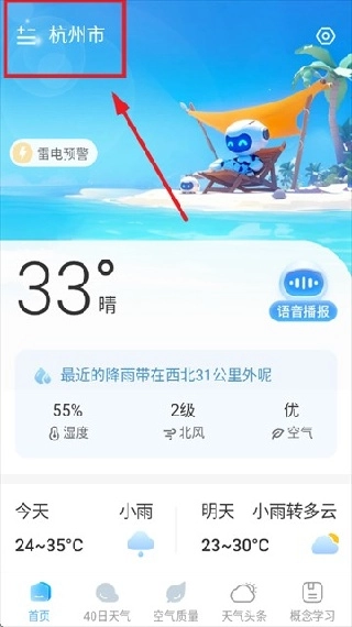 打开智图天气 ,进入后点击左上角的城市按钮;