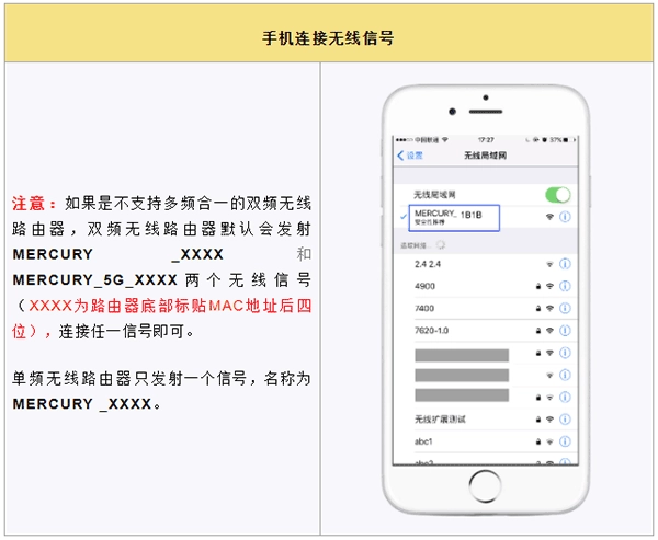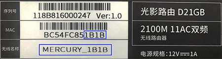 本文以支持多频合一功能的双频路由器作为示例,可在路由器底部的标贴处查看其出厂时的无线信号名称,通常格式为MERCURY_XXXX(其中XXXX对应路由器底部标贴MAC地址的后四位),具体参考下图: