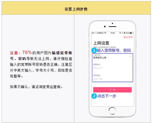 点击“确定”按钮后,页面会跳转至下一个界面。此时路由器将自动检测您的上网方式,若检测结果显示为“宽带拨号上网”,请在相应的设置区域准确填写运营商提供的宽带账号与密码,随后点击“下一步”按钮,具体操作可参考下方图示。