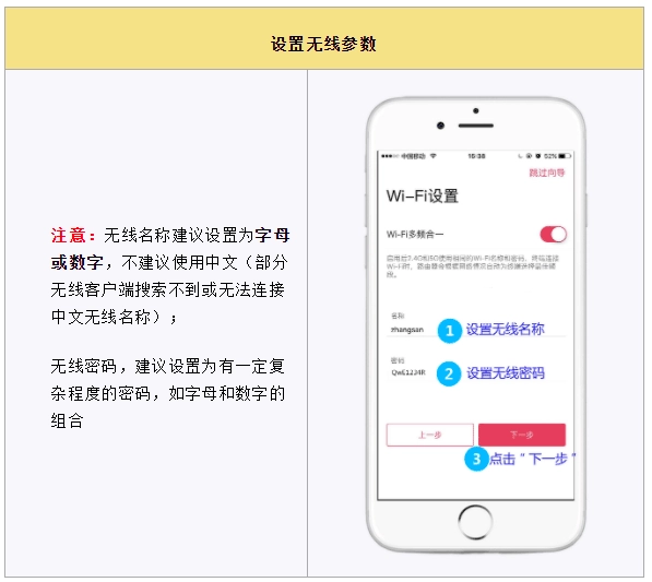 接下来进入无线参数配置界面,设置无线网络的名称和密码,然后点击“下一步”按钮。具体操作可参考下图: