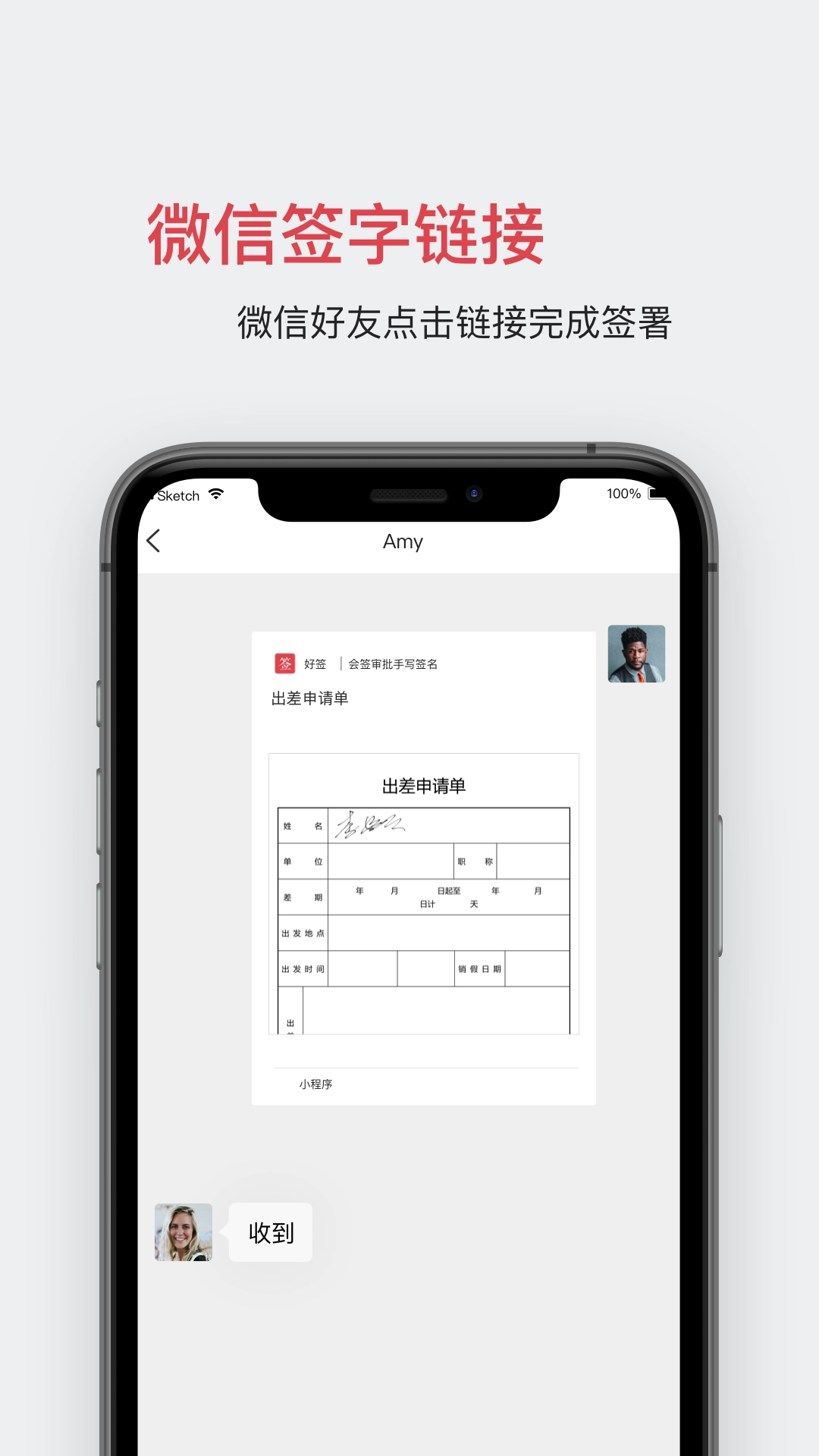 可以一键生成微信签字链接并分享,对方只需在微信中打开该链接就能完成签字操作。