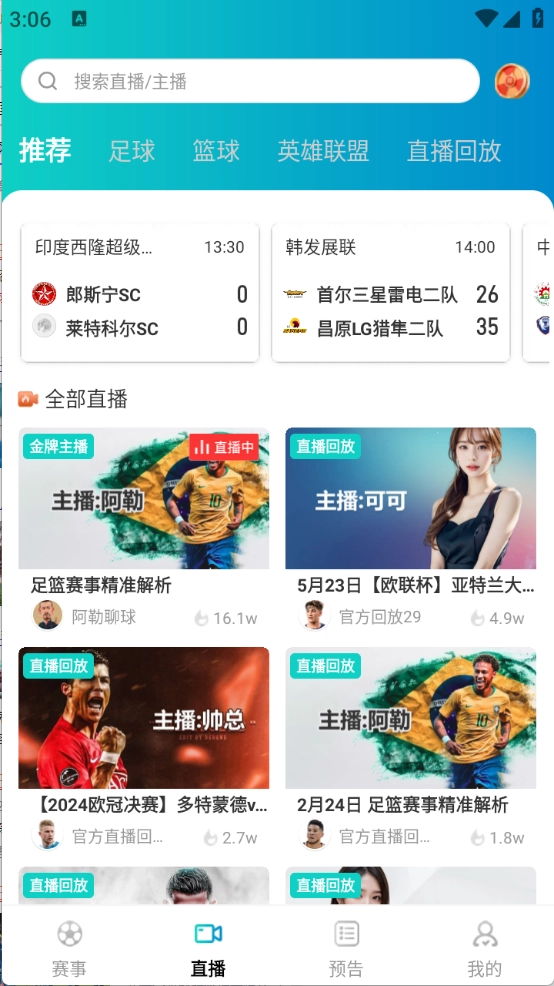 供国内外足球、篮球赛事的实时直播,同时支持赛事回放功能,让用户不错过任何一场精彩比赛。