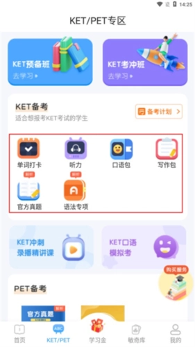 点击进入KET/PET专区,这里为用户准备了丰富的优质学习资源,涵盖听力、口语、写作练习以及各类真题等内容。