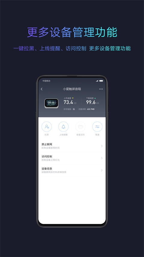 设备管理清单:无论何时何地都能管控已联网的设备,设备状态清晰直观。你能够根据不同需求,对任意一台设备的网络接入权限、数据读取权限进行个性化设置,还可以智能调配带宽资源,甚至能为设备自定义一个昵称。