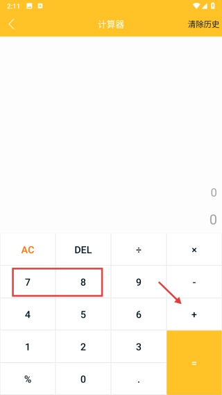 在计算器界面,依次输入数字78,然后点击+号。