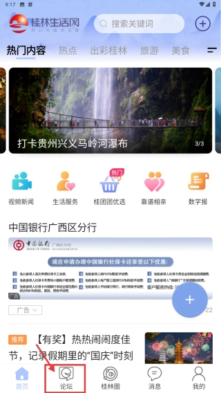 打开桂林生活网应用程序,点击底部的论坛选项,进入桂林人论坛页面。