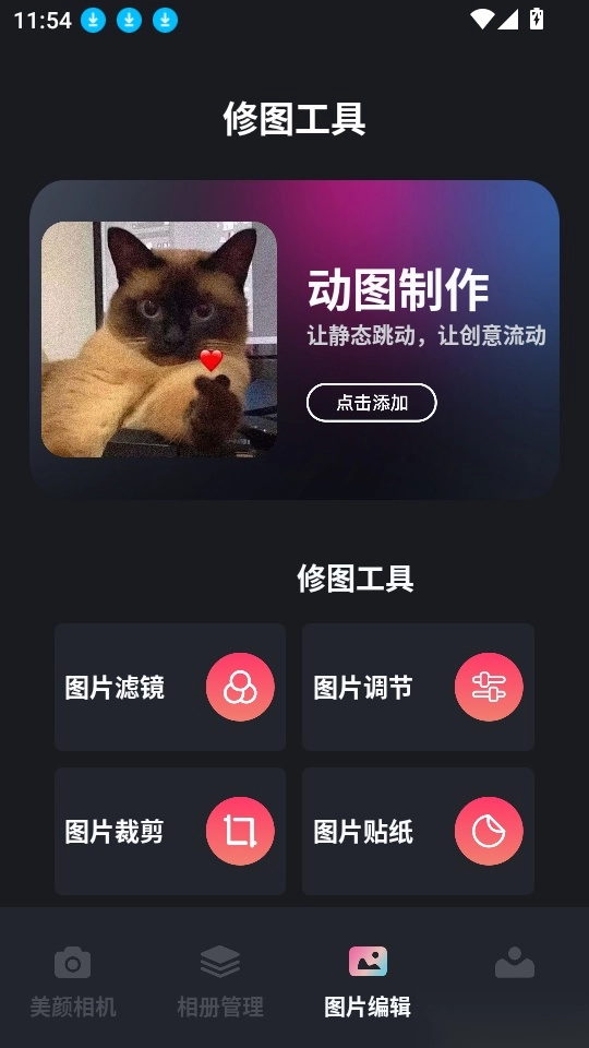 在软件的美颜相机界面底部菜单栏里,找到“图片编辑”按钮并点击进入。