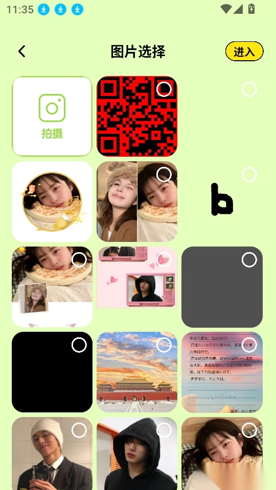 接着在本地相册里挑选图片,选好所需图片后,点击右上角的“进入”按钮,即可进入下一步操作。