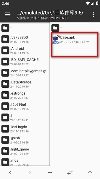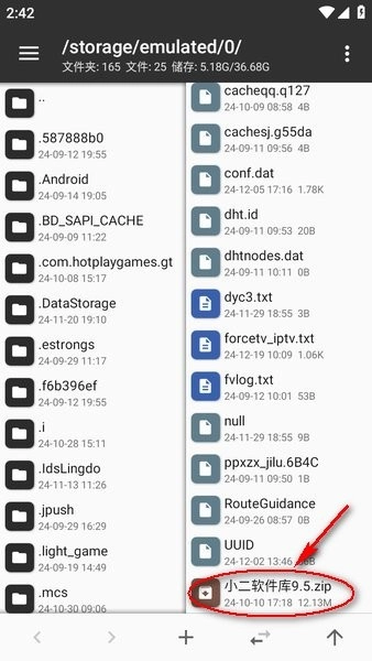 进入文件管理界面后,找到需要解压的文件,例如下图中的“小二软件库9.5.zip”。