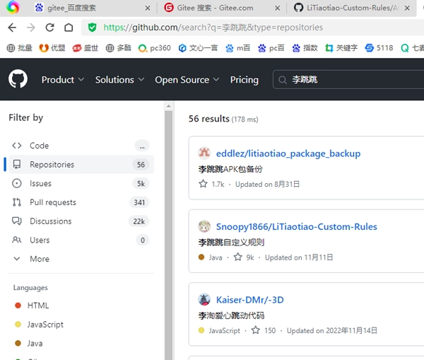 用户可以到GitHub获取最新代码,不过这个网站在国内有时访问不了。国内最大的开源代码库Gitee上并没有存放这些规则代码,下图是在Gitee搜索相关规则代码的结果,大家不用在这里浪费时间查找了。