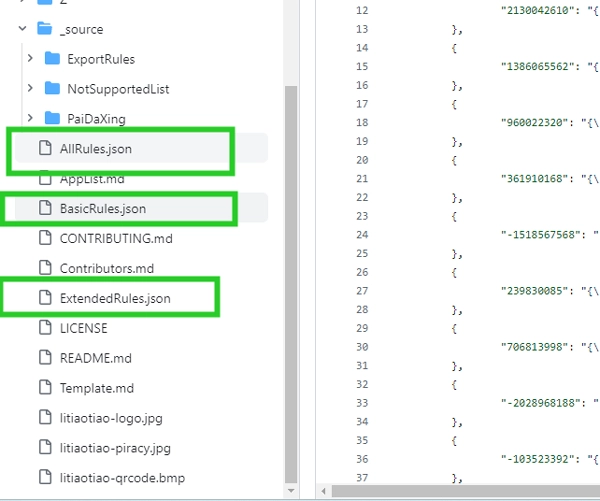 不过在这里,小编已经把最新的代码完整复制过来了。这里主要提供了三类规则代码:基础规则代码、扩展规则代码,以及全部规则代码。从字面意思不难理解,全部规则代码其实就包含了基础规则代码和扩展规则代码——这可不是小编随口说的,而是GitHub代码库列表里明确呈现的内容。 就像下面的图片展示的那样,用户只需在代码列表中找到JSON文件就行,这些规则代码都是以JSON格式编写的。稍微有编程经验的用户,一看到JSON文件就能明白它强大的跨平台文件交换功能,这种格式在很多编程场景中都用得上:不管是C++还是Java开发,不管是前端还是后端工程师,都会接触并使用到JSON格式的文件。
