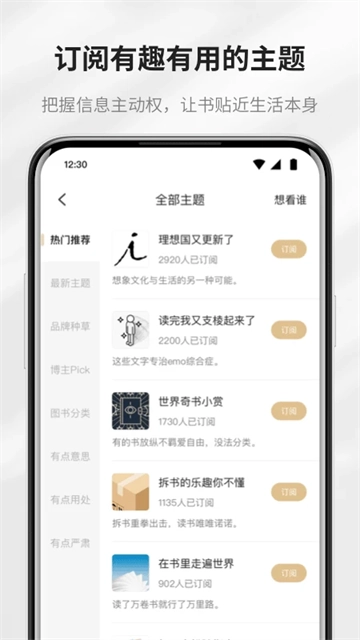 订阅有趣又实用的主题内容,主动掌控信息获取节奏,让书籍真正贴近生活的本真模样
